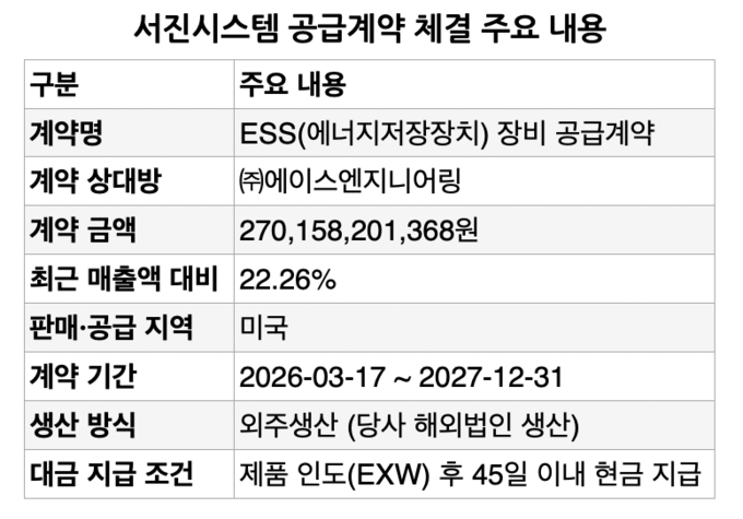 금융감독원 전자공시에 따르면 이번 계약은 서진시스템의 최근 매출액 대비 22.26%에 해당하는 규모다. 계약 기간은 2026년 3월 17일부터 2027년 12월 31일까지이며 판매 및 공급 지역은 미국이다. 생산은 서진시스템의 해외 법인을 통한 외주 생산 방식으로 진행된다.