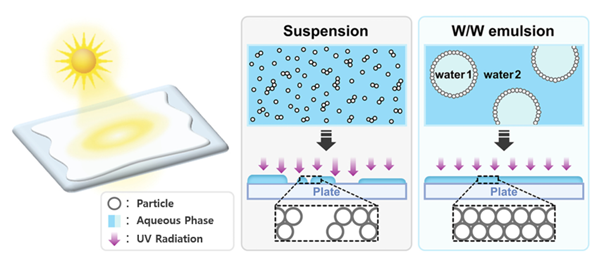 연구팀은 이러한 한계를 개선하기 위해 서로 다른 수용성 고분자가 물속에서 분리된 상을 형성하는 ‘수계 2상 시스템(ATPS)’ 원리를 적용한 W/W 에멀전 구조를 제형에 도입했다.