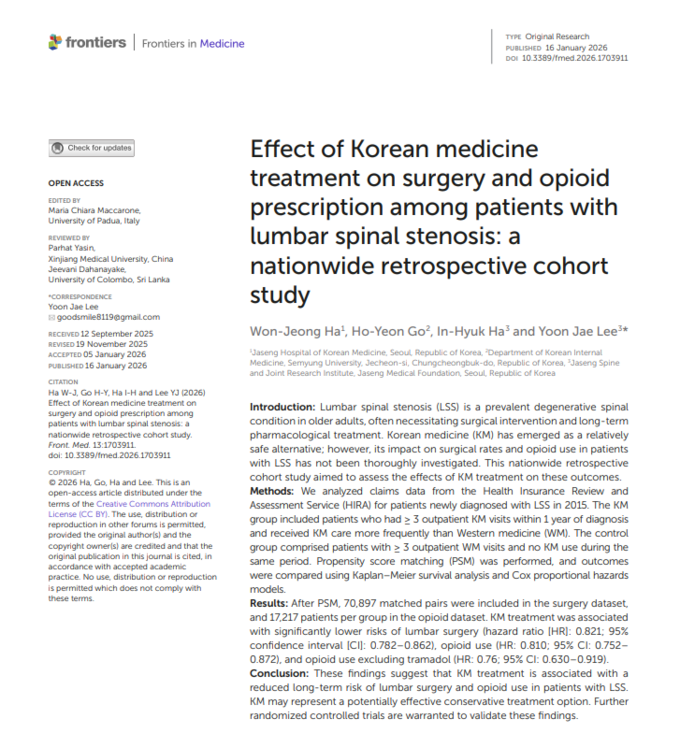 이번 연구는 한의통합치료가 이러한 치료 선택지 중 하나로서 수술 및 진통제 사용 감소와 연관될 수 있음을 보여준다는 점에서 의미가 있다는 설명이다.