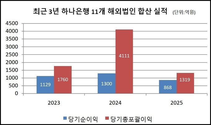 하나은행 2025년 사업보고서에 따르면 하나은행은 지난해 말 기준 ▲하나은행(중국)유한공사(중국) ▲캐나다KEB하나은행(캐나다) ▲독일KEB하나은행(독일) ▲PT Bank KEB Hana(인도네시아) ▲브라질KEB하나은행(브라질) ▲KEB하나뉴욕파이낸셜(미국) ▲KEB하나로스엔젤레스파이낸셜(미국) ▲KEB하나글로벌재무유한공사(홍콩) ▲러시아KEB하나은행(러시아) ▲Hana Bancorp, Inc.(미국) ▲멕시코KEB하나은행(멕시코) 등 11개 해외법인을 종속기업으로 두고 있다.
