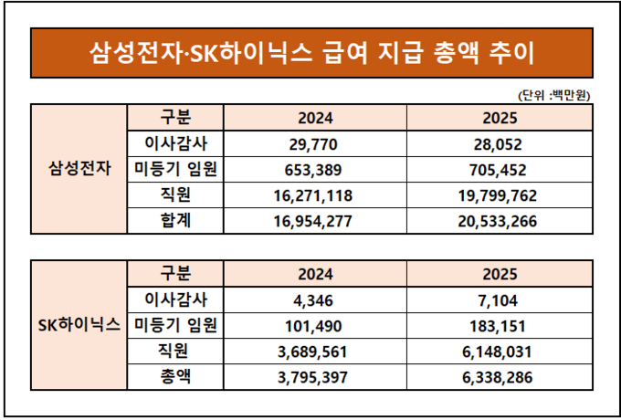 종합해보면 삼성전자와 SK하이닉스 모두 급여액 상승 속 보상 체계 차이가 확인됐다. 삼성전자는 등기이사 중심의 대규모 보수 인상을 통해 상층 중심 보상 체계를 보였고 SK하이닉스는 전사 호실적을 등기이사를 포함해 임원과 직원 등 전 직급 전반에 적절히 배분하는 구조를 택했다.