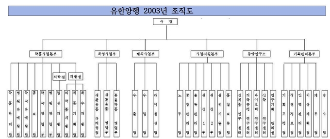 유한양행의 2000년대 초반 조직을 보면 연구개발 기능은 존재했지만 하나의 체계로 통합된 구조는 아니었다. 2003년 조직도 기준으로 중앙연구소가 별도로 운영됐지만 개발 기능은 ‘개발실’로 분리돼 있어 연구와 개발이 조직적으로 분리된 상태였다.