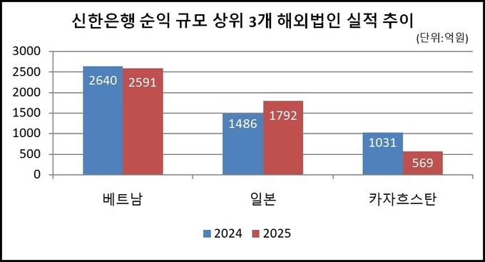 신한은행 해외법인의 순이익은 신한베트남·SBJ은행·신한카자흐스탄은행이 대부분을 차지하고 있다. 지난해 연간 실적 기준 3개 법인이 전체 해외법인 순이익에서 차지하는 비중은 84.4%에 달한다.