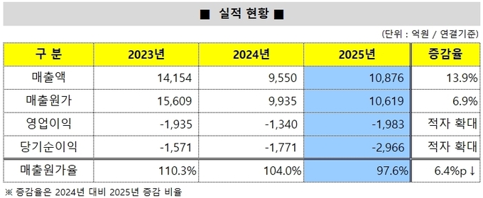 원가 부담도 여전히 높은 수준이다. 지난해 매출원가는 1조619억원으로 매출 대비 원가율은 97%대를 기록했다. 원가율은 소폭 개선됐지만 공사를 수행해도 이익을 확보하기 어려운 구조가 이어지면서 영업손실률은 18%대로 확대됐다. 여기에 차입 확대에 따른 금융비용 증가까지 더해지며 실적 부담이 커졌다는 분석이다.