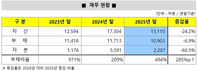 재무구조 역시 녹록지 않다. 지난해 말 기준 현금 및 현금성자산은 1603억원으로 전년 말 5751억원에서 크게 감소했다. 누적 손실 영향으로 자본이 줄면서 부채비율도 200%대에서 494%로 급등했다.