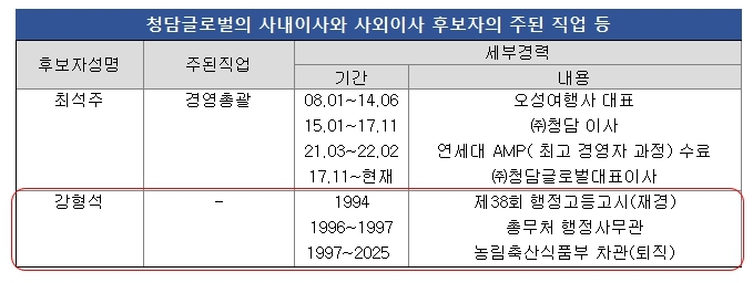 최근 청담글로벌은 31일 개최 예정인 2026년 정기 주주총회에 사내이사와 사외이사 선임 안건을 상정했다고 공시했다. 최석주 청담글로벌 대표를 사내이사로 재선임하고 강형석 전 농식품부 차관을 사외이사로 선임하는 내용이다.