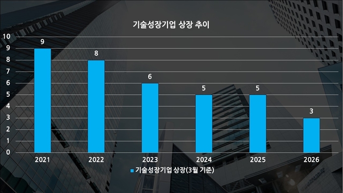 이는 지난해 같은 기간과 비교해도 다소 주춤한 흐름이다. 지난해 3월까지 기술성장기업으로 상장한 기업은 5곳이었다. 2024년에도 같은 기간 5곳이 상장했고, 2023년 6곳, 2022년 8곳, 2021년 9곳이었던 점을 감안하면 최근 들어 감소세가 한층 뚜렷해졌다는 평가가 나온다.