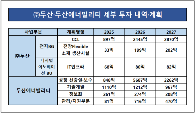 반면 일부 계열사는 투자 조정 기조가 나타났다. 두산밥캣의 2024년 투자액은 3295억원에서 2025년 3108억원으로 감소했고 두산퓨얼셀 역시 같은 기간 812억원에서 605억원으로 투자가 축소됐다. 전체 투자 규모를 유지하면서도 상대적으로 경쟁력이 떨어지는 사업 대신 핵심 사업 중심으로 자원을 재배치하는 흐름이다.