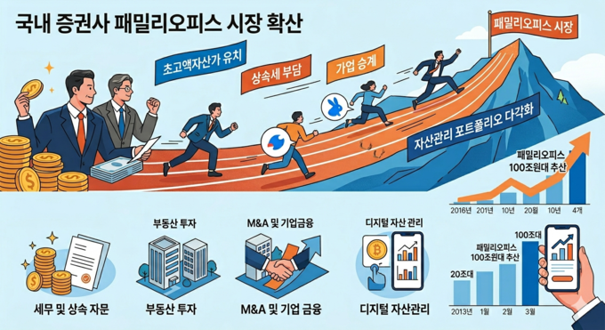 이에 따라 증권사들은 세무와 상속, 가업 승계와 M&A, 해외 이주와 부동산 자문까지 아우르는 종합 솔루션 체제로 빠르게 전환 중이다. 삼성증권이 2020년 패밀리오피스 서비스를 본격화한 이후 NH투자증권·KB증권·한국투자증권 등 대형사를 중심으로 확산됐다. 지난 19일에는 IBK투자증권이 중소기업 가업 승계에 특화된 패밀리오피스 서비스를 선보이며 경쟁에 가세했다.
