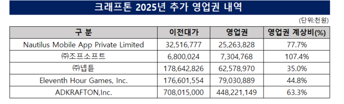 한편 크래프톤은 지난해 신규 IP 확장을 위해 공격적인 M&A 행보를 이어가며 영업권 규모가 크게 늘어났다. 크래프톤은 2025년 4월 카카오게임즈로부터 넵튠 지분을 약 1650억원에 인수한 데 이어, 6월에는 일본 광고·애니메이션 그룹 ADK를 약 750억엔(약 7080억원), 7월에는 액션 RPG ‘라스트 에포크’ 개발사 일레븐스 아워 게임즈를 약 9597만달러(약 1323억원)에 인수했다. 이에 따라 크래프톤의 영업권 총 장부금액은 2024년 7319억원에서 2025년 1조3479억원으로 늘어났다.