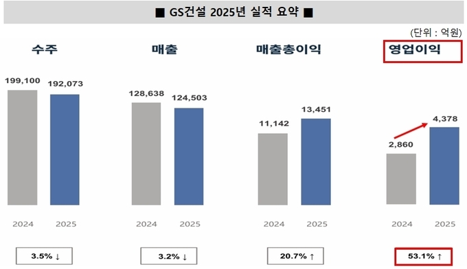 [FETV=박원일 기자] GS건설이 2025년 연간 실적에서 수익성 중심 체질 개선의 성과를 본격적으로 보여줬다. 외형은 다소 축소됐지만 이익 개선과 함께 주주환원 정책 강화, 사업 포트폴리오 재편을 병행하며 ‘턴어라운드’ 기반을 마련했다는 평가가 나온다.