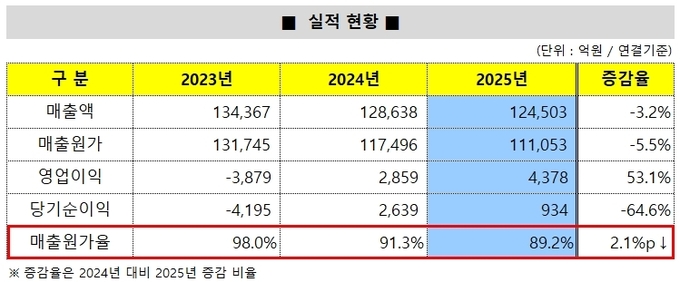 4분기 매출은 2조9834억원으로 전년 대비 감소했지만 영업이익은 569억원으로 41.5% 증가했다. 외형 축소 속에서도 수익성 개선 기조가 유지되고 있다는 점에서 연간 턴어라운드 흐름을 재확인했다는 평가다.