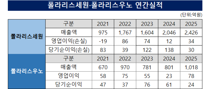 자회사들 중에서 폴라리스세원과 폴라리스우노의 성장이 두드러졌다. 폴라리스세원은 편입 직후인 2023년 1604억원에서 2024년 2046억원, 2025년 2426억원으로 증가하며 역대 최대 매출을 기록하며 외형 확대 흐름을 이어갔다.