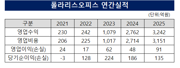 지난 23일 폴라리스오피스가 공시한 사업보고서에 따르면 폴라리스오피스는 2025년 연결기준 매출 3242억원을 기록했다. 창립 이후 역대 최대 매출 기록이다. 또 영업이익은 91억원을 기록했는데 이는 전년 48억원과 비교하면 90% 증가한 금액이다.