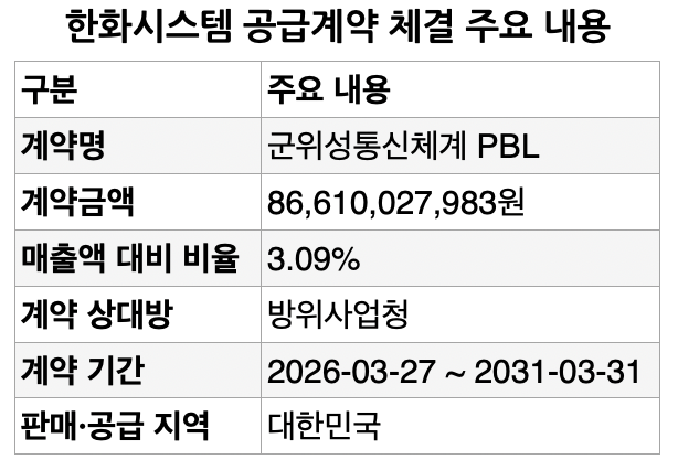 금융감독원 전자공시에 따르면 계약 금액은 866억1002만7983원 규모다. 한화시스템의 2024년 연결 기준 매출액인 2조8036억8605만8274원 대비 3.09%에 해당하는 수치다.