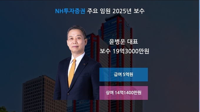 30일 NH투자증권에 따르면 윤병운 대표는 지난해 총 19억3000만원의 보수를 받았다. 등기이사 2명의 보수총액이 19억9800만원인 점을 감안하면 전체의 96.6%를 차지하는 수준이다.