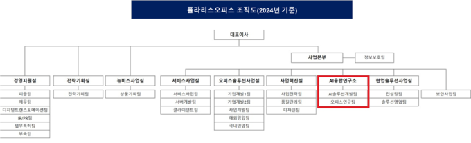 눈에 띄는 건 AI융합연구소의 출범이다. 2024년 조직도에서 AI융합연구소는 AI솔루션개발팀과 오피스연구팀을 산하에 두고 별도 조직으로 올라섰다. 이는 기존 연구 부서가 단순한 보조 조직 수준을 넘어 AI를 중심으로 한 독립 연구 체계로 격상됐다..
