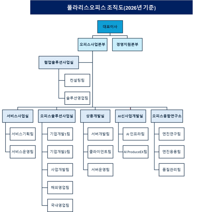 변화의 분기점은 2024년이다. 이 해부터 폴라리스오피스는 기존 통합형 오피스사업실 체계를 보다 세분화된 전문 조직으로 개편했다. 사업본부 아래 서비스사업실, 오피스솔루션사업실, 사업혁신실, AI융합연구소, 협업솔루션사업실을 병렬로 배치하면서 기능별 역할을 나눴다. 서비스사업실은 서비스사업팀, 서버개발팀, 클라이언트팀 등 제품 기획과 개발 기능을 맡았고 오피스솔루션사업실은 기업개발1팀, 기업개발2팀, 사업개발팀, 해외영업팀, 국내영업팀 등 B2B와 영업 기능을 담당했다. 사업혁신실은 사업전략팀, 품질관리팀, 디자인팀으로 구성돼 전략과 품질, 디자인을 총괄하는 역할을 맡았다.