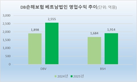 31일 DB손보가 공시한 ‘2025년 사업보고서’에 따르면 DBV(DBV Insurance Group Joint Stock Company), BSH(Sai Gon Hanoi Insurance Corporation) 등 2개 베트남법인의 지난해 영업수익 합산액은 4469억원으로 전년 3582억원에 비해 887억원(24.8%) 증가했다.