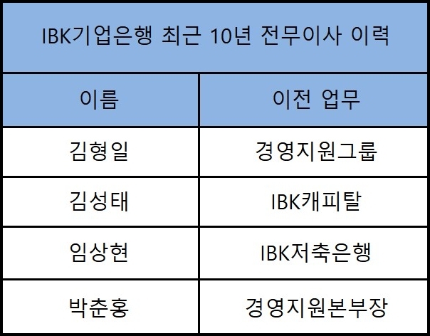 기업은행 전무이사는 은행장 제청으로 금융위원회가 임면한다. 최근 10년 기준 과거 이동 사례를 살펴보면 먼저 김형일 전무이사는 전무이사로 이동하기 전 경영지원그룹장을 맡았다. 김형일 전무이사 이전 전무이사는 김성태 전 은행장이었다. 김성태 은행장은 2020년 3월 전무이사 선임 이전에는 IBK캐피탈에서 대표이사직을 수행했다.