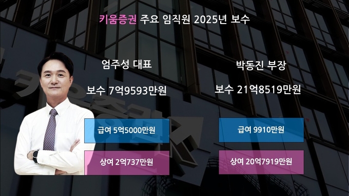 1일 금융감독원 전자공시시스템에 따르면 키움증권은 지난해 등기이사 3명에게 총 18억8866만원의 보수를 지급했다. 이 가운데 이현 부회장이 8억3160만원, 엄주성 대표이사가 7억9593만원을 받았다.