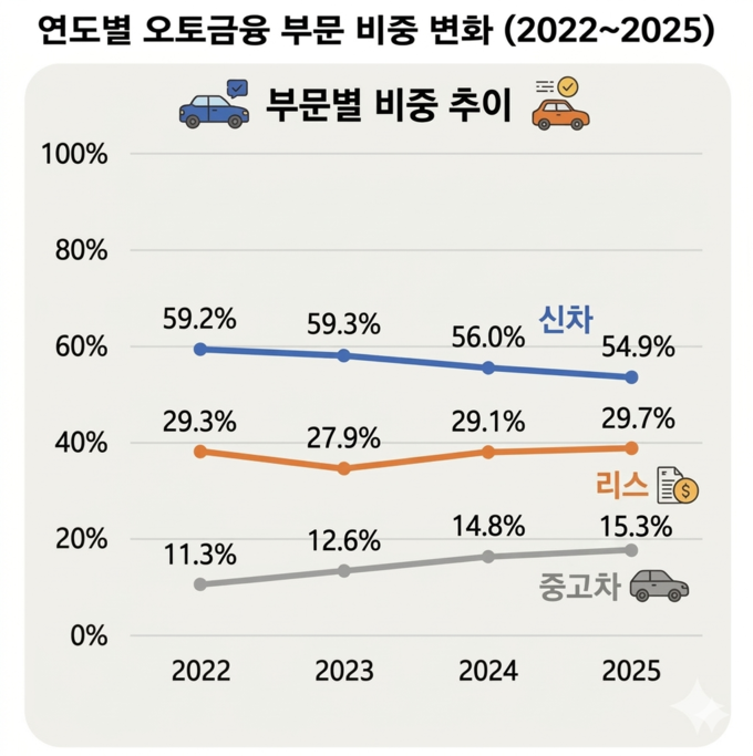 가파른 성장세를 보이는 자산은 리스·중고차 부문이다. 리스 자산은 2023년 7조9331억원에서 2024년 8조3340억원, 2025년 8조8025억원으로 꾸준히 증가했다. 중고차 자산 역시 같은 기간 3조5744억원에서 4조2285억원, 4조5458억원으로 확대되며 성장세가 이어졌다.