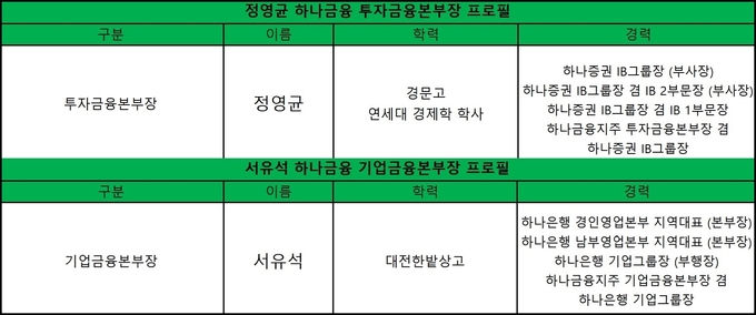 투자금융본부와 기업금융본부를 이끄는 인물은 정영균 부사장과 서유석 부사장이다. 2명 모두 올해 하나금융 부사장으로 신규 선임됐다.
