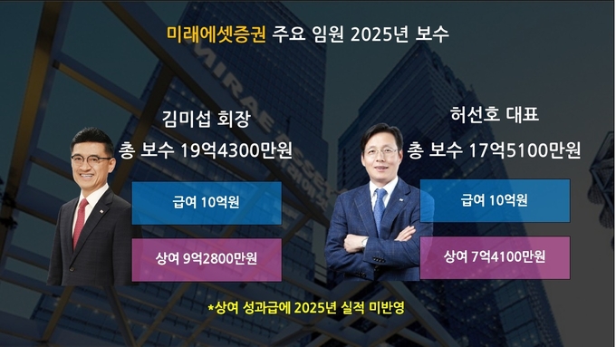 [FETV=이건혁 기자] 미래에셋증권의 지난해 등기이사 보수는 각자대표 체제 아래 비교적 고르게 배분된 것으로 나타났다. 해외법인과 WM(자산관리) 부문이 실적 개선을 이끌면서 김미섭·허선호 대표의 보수도 나란히 10억원대를 기록했다.