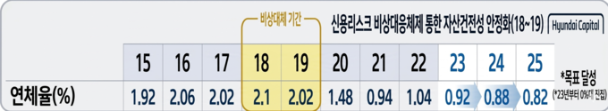 현대캐피탈도 과거 연체율이 2%를 웃돌던 시기가 있었다. 2016년 이후 연체율이 2%대로 상승하자 2018년 3분기부터 2019년 3분기까지 1년간 신용리스크 비상대응체제를 가동하고 취약 차주 비중을 일정 수준 이하로 관리하는 컷오프 정책을 도입했다.