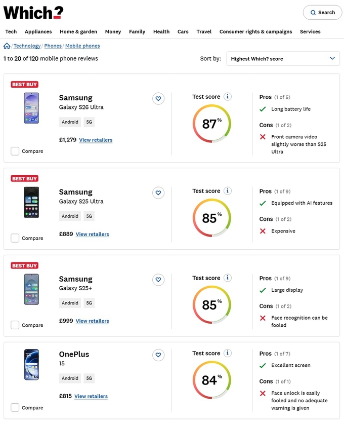 영국 위치, 프랑스 크 슈아지르, 이탈리아 알트로콘슈모, 스페인 오씨유, 포르투갈 데코 프로테스트, 벨기에 테스트 아차트, 스웨덴 레드앤론 등 주요 소비자연맹지가 최고 스마트폰으로 선정했다. 이탈리아, 스페인, 포르투갈, 벨기에에서는 ‘Best of Test’도 획득했다.