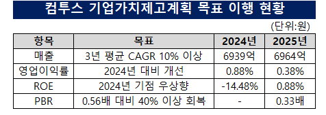 컴투스는 작년 3월 기업가치 제고 계획을 통해 2025년부터 2027년까지 3년 평균 매출 성장률(CAGR) 10% 이상을 유지하고 2025년 이후 자체 개발 및 외부 퍼블리싱 신작을 바탕으로 2024년 대비 영업이익률을 끌어올리겠다는 목표를 제시했다. 또 2022~2023년 평균 3.2%였던 ROE를 2024년을 기점으로 우상향시키고 평균 0.56배 수준인 주가순자산비율(PBR)도 2025년 이후 40% 이상 회복하겠다는 방침을 내놨다.