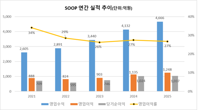 이러한 체질개선 과정을 거치며 SOOP의 실적은 우상향 구도를 보였다. 2021년 이후로 매출규모는 최대 기록을 늘 갱신해왔지만 2024년부터는 1년만에 4000억원이 넘는 매출을 기록했고 2025년에는 약 4666억원을 기록하며 전년 대비 약 11% 증가했다. 영업이익의 경우도 2024년과 2025년에 걸쳐 각각 전년 대비 20%, 9% 증가하며 연이어 최대 실적 기록을 갱신하는 성과를 기록했다.