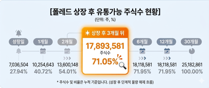 [FETV=김예진 기자] 폴레드가 상장 3개월 시점에 유통 가능 물량이 집중되는 수급 구조를 형성하고 있다. 단계적 보호예수 해제와 함께 미행사 스톡옵션 등 잠재적인 지분 희석 요인이 대기하고 있어 상장 이후 대주주의 경영권 방어와 지배력 유지가 핵심 과제로 부상할 전망이다.
