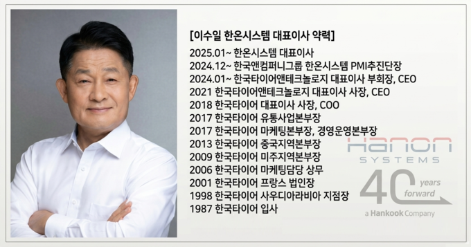 이수일 대표는 1987년 한국타이어에 입사한 내부 인사로 입사 이후 글로벌 주요 시장에서 요직을 담당해온 인물이다. 사우디, 프랑스, 미국, 중국 등 해외 거점을 거치며 마케팅·영업·유통 전반을 담당했고 한국타이어 대표 시절 역대 최대 실적을 이끈 경험을 갖고 있다. 이 대표는 이러한 글로벌 사업 경험을 바탕으로 조현범 회장의 신임을 받았고, 한온시스템의 그룹 편입 초기 조직 안정화와 운영 체계 정비를 주도하기 위한 적임자로 채택됐다.