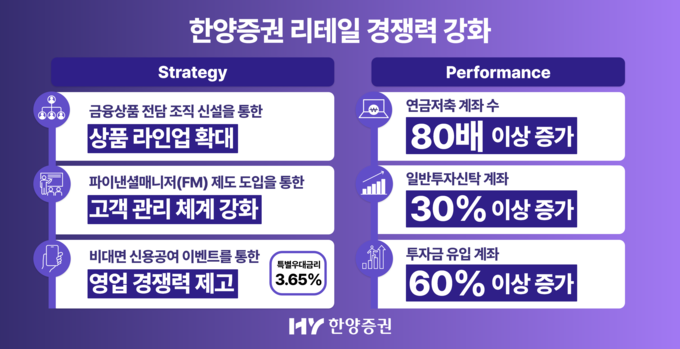 한양증권 관계자는 “금융상품 라인업 확대 개편과 파이낸셜 매니저 기반 고객 관리 체계 구축, 특별 인센티브 제도 도입, MTS 고도화 등 리테일 사업 전반을 동시에 재편한 결과 실제 투자로 이어지는 고객 기반의 확대를 추구하고 있다”며 “상품 경쟁력을 더욱 강화하고 디지털 채널 완성도를 높여 고객 유입부터 투자, 자산 관리까지 이어지는 리테일 서비스 전반을 고도화할 계획”이라고 말했다.