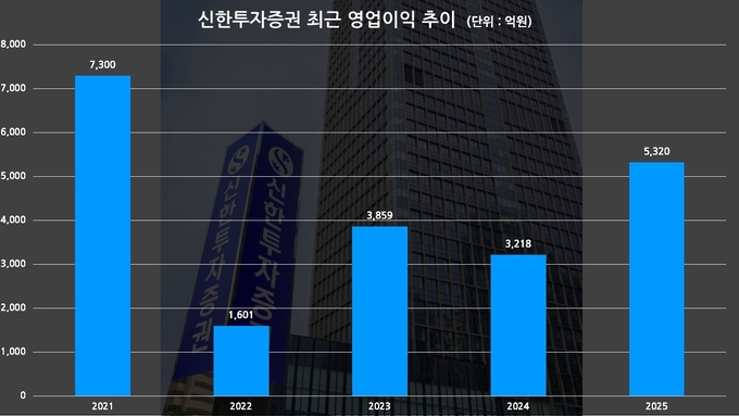 신한투자증권이 공격적인 투자 기조를 꺼내 든 배경에는 영업력 회복 흐름이 자리하고 있다는 분석이다. 신한투자증권의 별도 기준 영업이익은 2021년 7300억원에서 2022년 1601억원으로 급감한 뒤 2023년 3859억원, 2024년 3218억원, 2025년 5320억원으로 회복했다. 아직 2021년과 비교하면 27.1% 낮은 수준이지만 반등 흐름은 분명하다는 평가다.