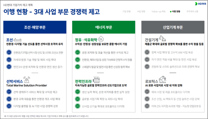 HD현대 관계자는 "기업가치제고계획의 경우 배당성향이나 지배구조 준수율 등 핵심 목표 위주로 공시되고 있다"며 "수소, SMR, 해상풍력 등 기존 신사업 성과의 경우 보도자료 등 다른 채널을 통해 공개가 되고 있다"고 전했다.