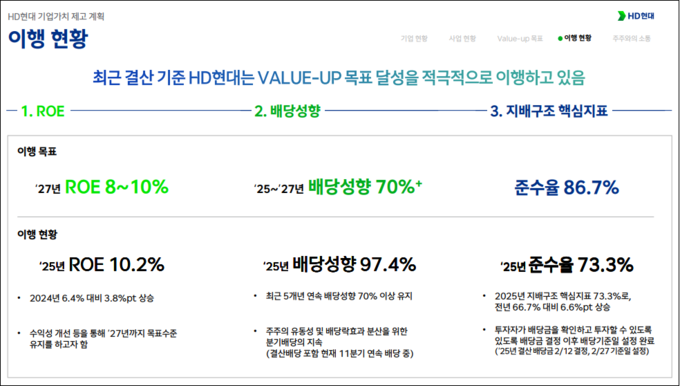 HD현대는 2024년 말 기업가치제고계획을 통해 2027년까지 ROE(자기자본이익률) 8~10%, 배당 성향 70% 이상, 지배구조 핵심지표 준수율 86.7% 이상 등을 3대 목표로 제시했다. 이를 통해 당시 HD현대는 그룹 기존 사업 안정화와 주주환원 확대, 거버넌스 개선을 동시에 추진하는 구조를 확립했다.