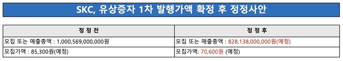 최근 SKC는 유상증자 조달 자금 총 규모가 당초 1조원에서 8200억원 가량으로 축소됐다. 주가 하락에 따른 영향이다. 지난 3일 확정된 유상증자 1차 발행가액은 7만600원이다. 이는 당초 예정 발행가인 8만5300원보다 축소된 금액이다. 발행가액이 낮아지자 총 규모도 축소됐다. 조달된 자금은 차입금 상환에 4100억원, 타법인증권취득에 5900억원이 투입될 예정이었다. 조달 규모 축소 영향은 차환 금액 감소(2385억원)로 이어졌다. 타법인증권취득 투자 금액은 조정되지 않았다.