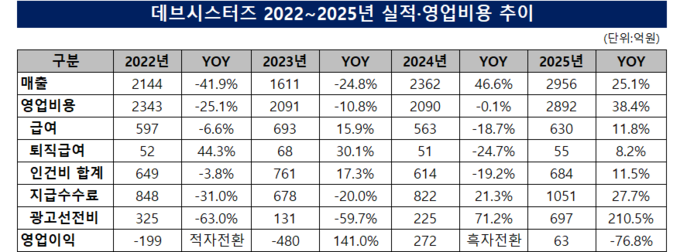 [FETV=신동현 기자] 데브시스터즈는 '쿠키런: 킹덤' 흥행으로 역대 최대 실적을 기록하며 도약했지만 1년 만에 다시 하락세로 돌아섰다. 이에 조길현 대표이사 체제로 리더십 변화를 주는 선택을 했고 지난 2년간 매출 규모는 회복세를 보였다. 다만 지난해에는 영업비용 증가를 제어하지 못하면서 수익성 방어에는 아쉬운 모습을 보였다.