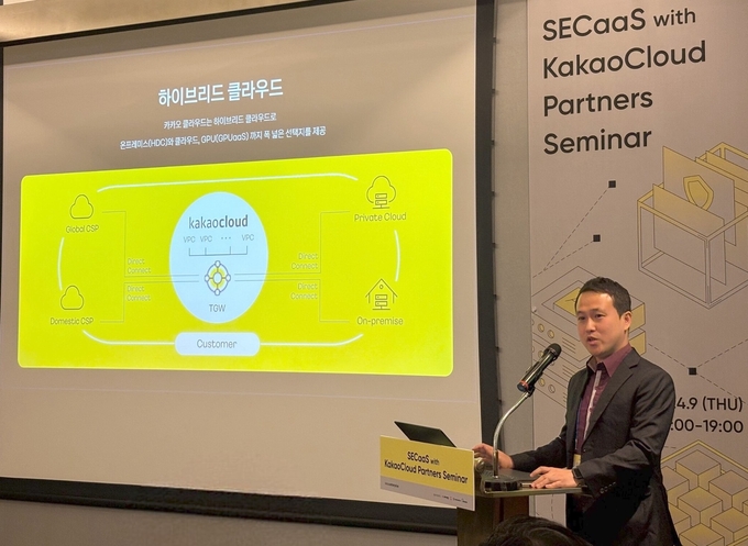 [FETV=신동현 기자] 카카오엔터프라이즈는 10일 경기 성남시 판교 인근에서 카카오뱅크, 카카오페이, 카카오엔터테인먼트 등 주요 카카오 계열사 보안 담당자를 대상으로 클라우드 보안 세미나를 열었다. 이번 행사에는 팔로알토네트웍스코리아, F5코리아, 센티넬원, 아카마이코리아가 참여해 AI 확산에 따른 보안 위협 대응 방안과 최신 보안 트렌드를 공유했다. 카카오엔터프라이즈는 카카오클라우드 기반 서비스형 보안(SECaaS) 모델과 보안 거버넌스 구축 방향도 소개했다. 사진은 임병두 카카오엔터프라이즈 서비스보안팀장이 카카오클라우드 기반의 클라우드 보안 서비스 ‘SECaaS(서비스형보안)’에 대해 발표하고 있는 모습. [사진 카카오엔터프라이즈]