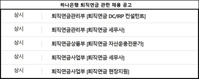 하나은행은 최근 퇴직연금사업부, 퇴직연금상품부, 퇴직연금관리부 등에서 근무할 세무사, 자산운용전문가, DC·IRP 컨설턴트 경력자를 모집하고 있다.