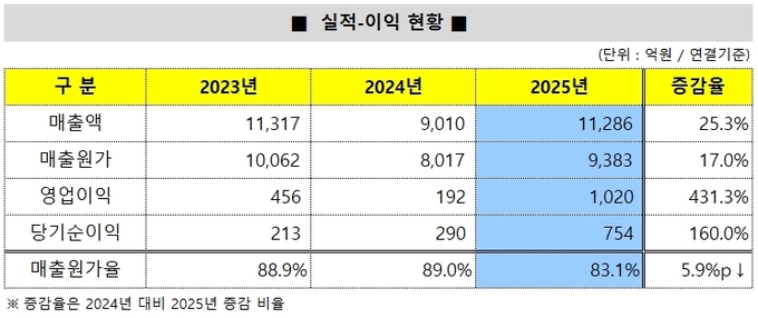 눈에 띄는 변화는 수익성 지표다. 매출원가율이 80% 초반대로 낮아지며 전년 대비 뚜렷한 개선을 보였고 이에 따라 영업이익률과 순이익률도 각각 9%, 6%대까지 상승했다. 원가 관리 강화와 채산성이 높은 사업장 중심의 공정 진행이 맞물린 결과로 풀이된다.