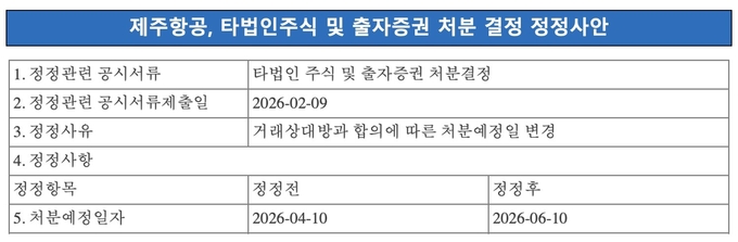 10일 제주항공은 IT 계열사인 AK아이에스의 처분예정일을 변경했다고 공시했다. 처분예정일자는 4월 10일에서 6월 10일로 두 달 연기됐다. 사유는 거래상대방과 합의에 따른 것이라고 밝혔다. 경영 계획 조정에 따른 단순 일정 조정이라는 설명이다. 이번 정정 공시에는 "이사회 승인에도 불구하고 중단될 수 있다"는 내용은 삭제됐다.