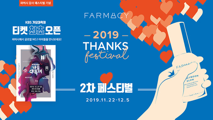[FETV=김윤섭 기자] 파머시(FARMACY)는 국내 최정상급 글로벌 아이돌이 출현하는‘KBS 가요대축제’의 방청권과 특별 쇼핑 지원금을 증정하는 ‘Thanks Festival’ 이벤트 2회차를 진행한다고 22일 밝혔다.