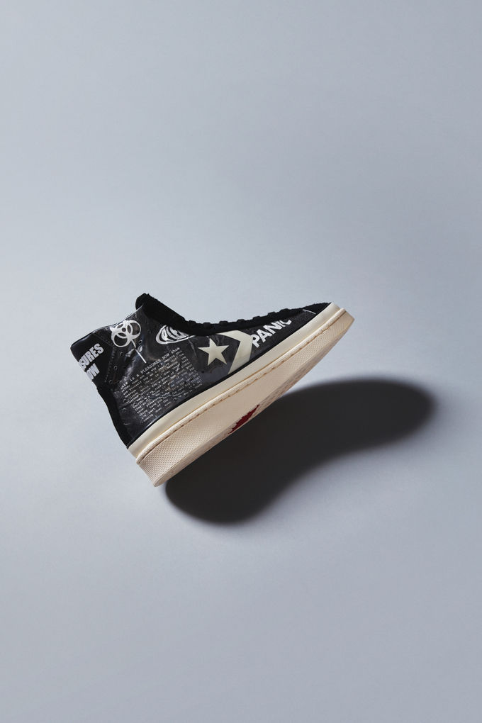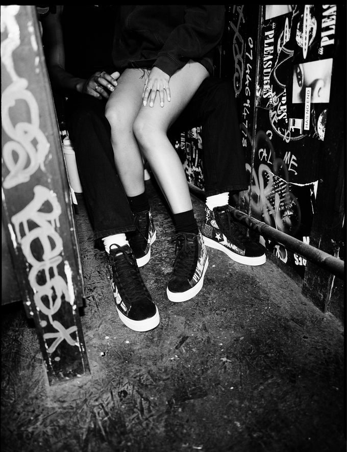 컨버스 X 플레져스는 알렉스가 성장한 뉴욕과 LA에서 봤던 스트리트 아트에서 영감을 받은 블랙 앤 화이트 그래픽에, 그래픽을 보호하기 위한 투명한 아우터 레이어가 돋보이며 아킬레스 패치에는 브랜드 태그, "PLEASURES NOW" 가 새겨져 있는 것이 특징이다.