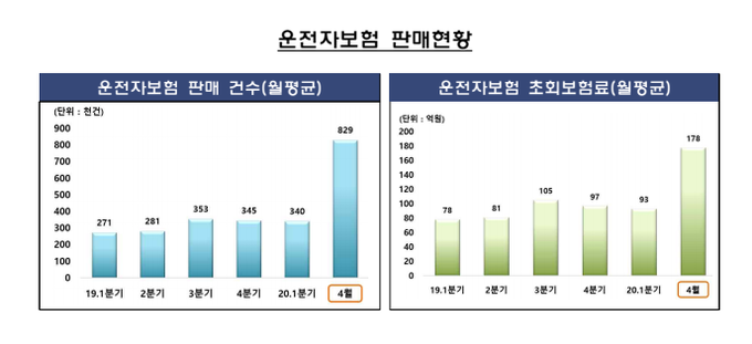 지난 4월 한 달 간 운전자보험 판매 건수가 평균 83건으로, 지난 1분기 월 평균 34만 건보다 두 배 넘게 늘었다. 이는 최근 민식이법 시행으로 자동차사고로 인한 형사.행정상 책임에 대한 비용을 우려한 운전자들이 기존 보험이 있는데도 추가로 가입하는 경우가 많기 때문으로 분석된다.