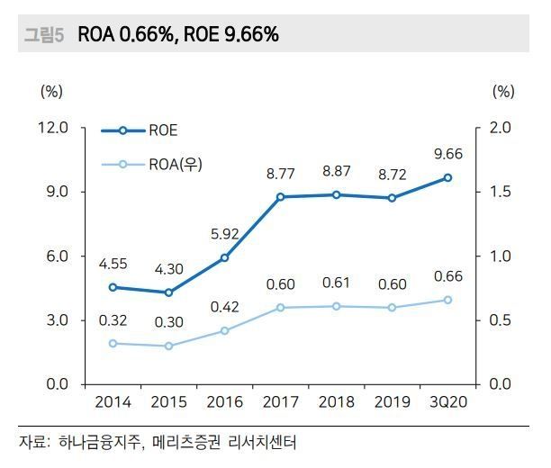 은행 외 증권, 카드, 캐피탈 등 대부분의 비은행 계열사도 호실적을 기록하며 실적 개선에 힘을 보탰다. 다른 은행들과 달리 바젤3 도입 전이라는 점에서 상당한 자본력을 갖추게 된 셈이다. 4분기 코로나19 충당금 추가 전입, 계절적 판관비 지출 등을 감안해도 2.4조원 이상의 지배순이익 달성이 가능할 것으로 분석한다.