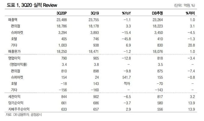DB금융투자의 연결기준 매출액은 추정치를 상회했지만, 영업이익은 기대치를 소폭 하회했다. 부문별로 영업이익을 나눠보면 편의점 부문은 코로나19 재확산으로 추정치를 7.4%p 하회했으며 호텔사업 적자폭은 18억원으로 우려보다(70억원) 크지 않았다.
