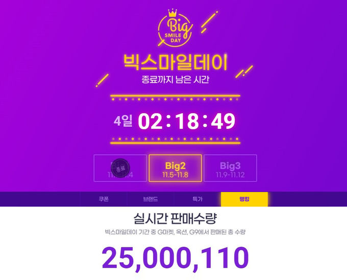 이베이코리아는 G마켓과 옥션, G9에서 진행 중인 ‘빅스마일데이’ 행사의 누적 판매량이 2500만개를 넘어섰다고 9일 밝혔다.